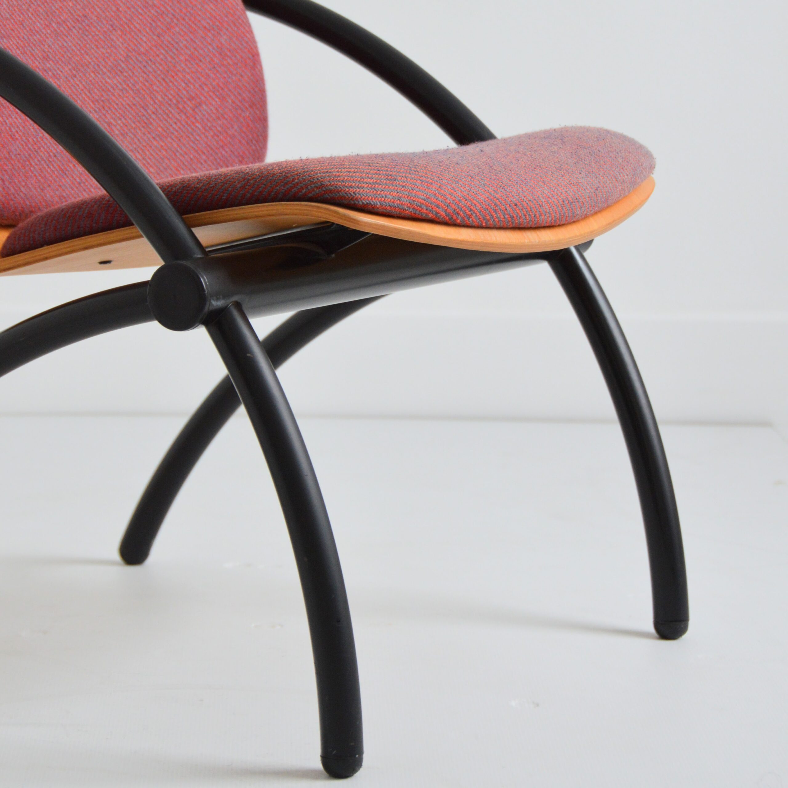 Dossier en bois multiplie recouvert d'un lainage rosé et bleu.