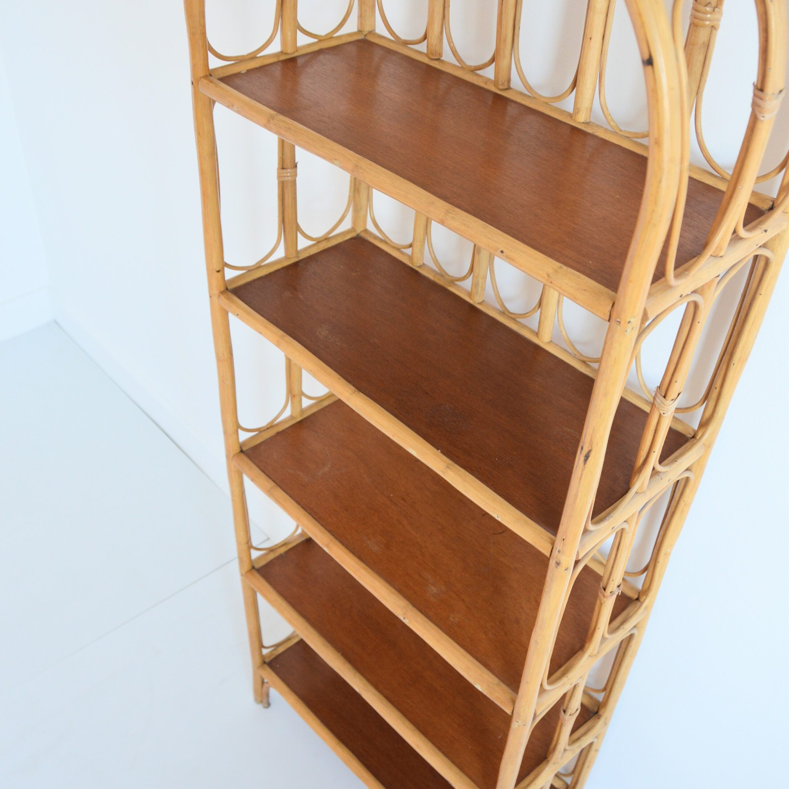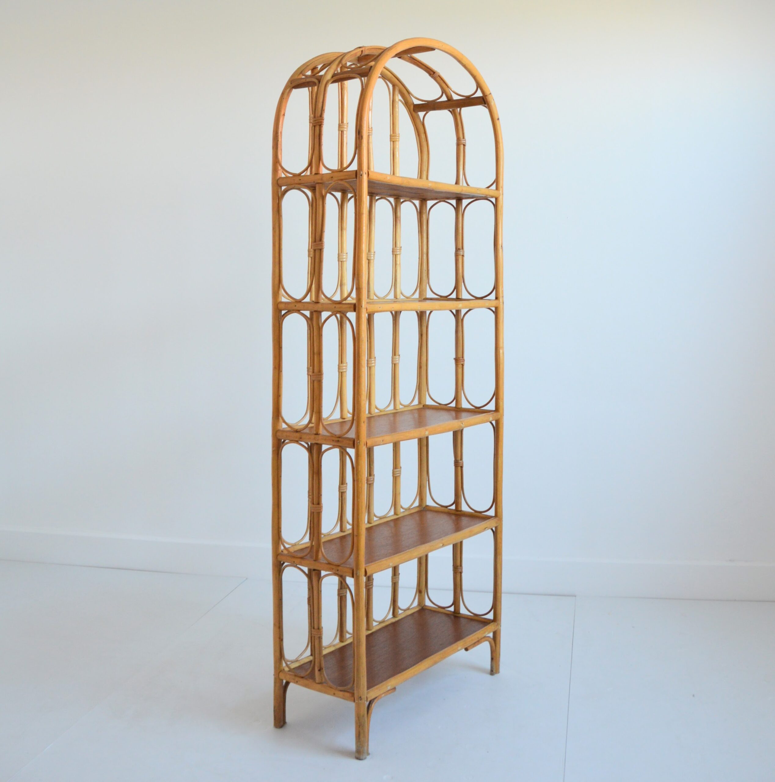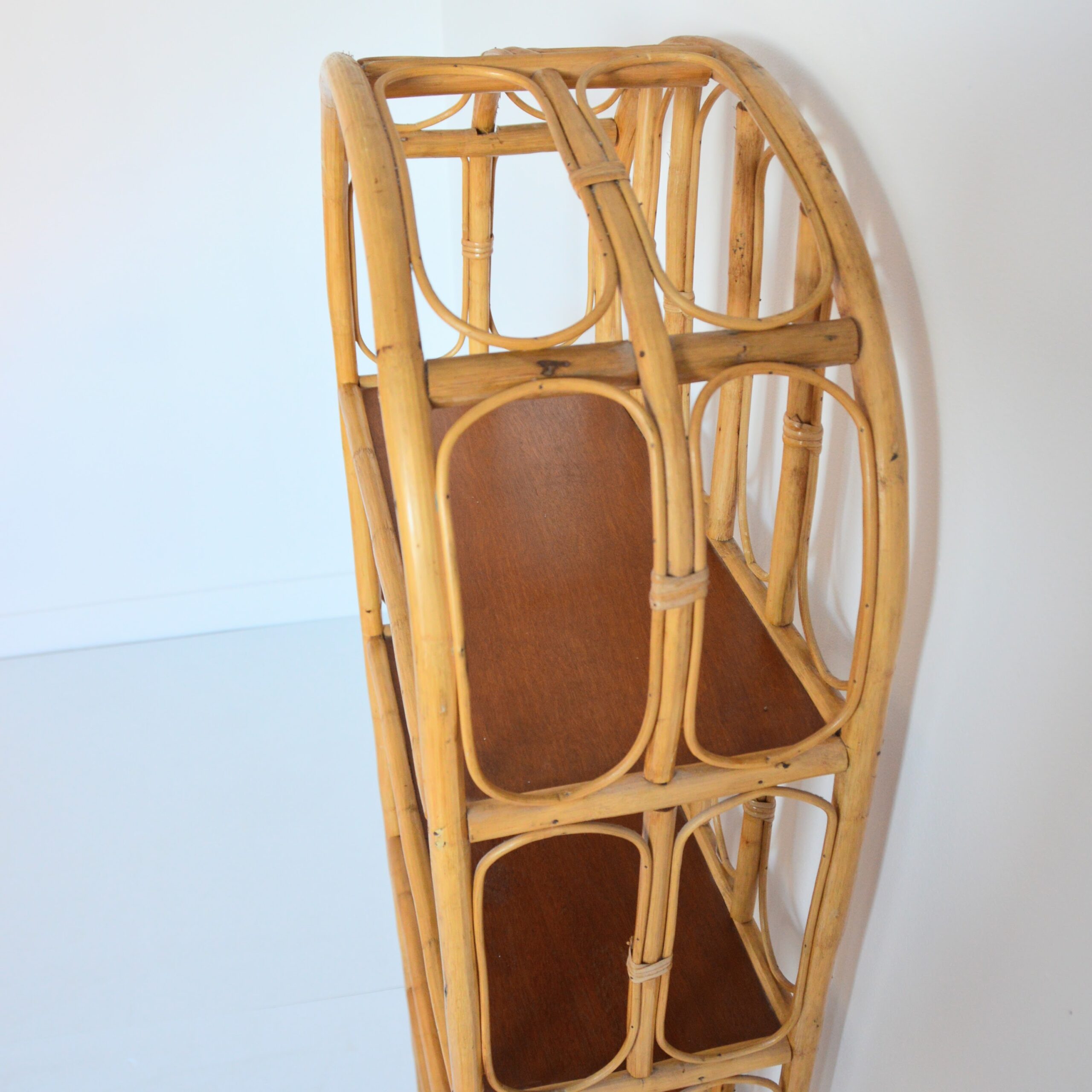 Bibliothèque / Étagère sur pied en bambou et rotin.